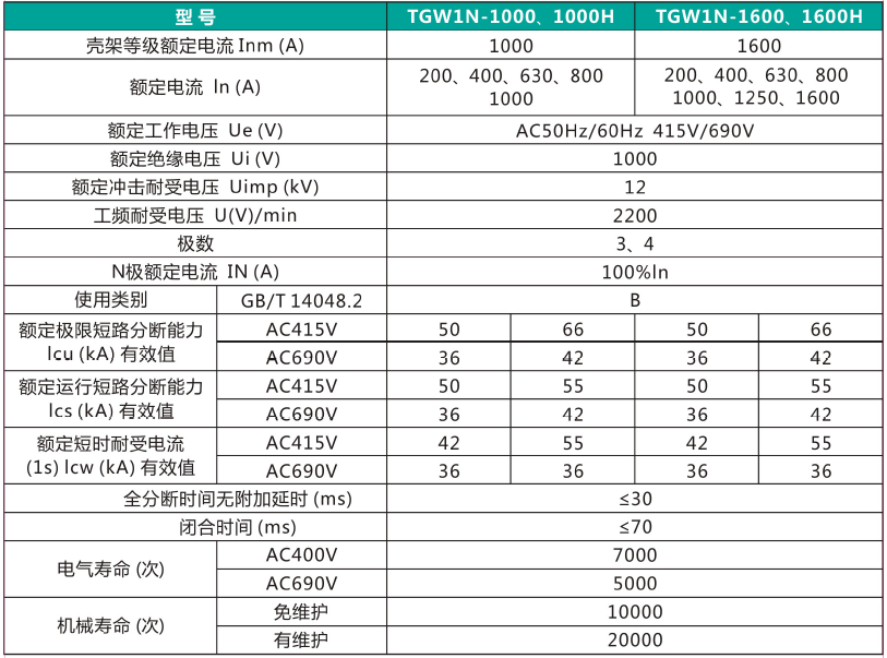 TGWG 系列万能式断路器,适用于交流50Hz,额定电压AC380V~AC690V,额定电流200A~6300A 的配电网络中,用来分配电能和保护线路及电源设备免受过载、短路、欠电压、单相接地或剩余电流等故障的危害。该断路器具有可通信及智能化保护功能,能提高供电可靠性,避免不必要的停电。
